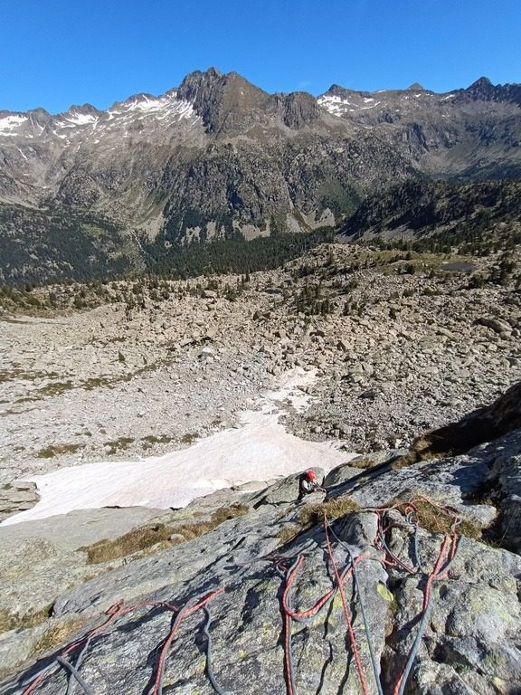 Hay que tener en cuenta, que tiene orientación norte y estamos en altura, por lo que al inicio del verano, puede haber nieve en la base como nos pasó a nosotros, y tuvimos que acceder con la ayuda de un piolet.