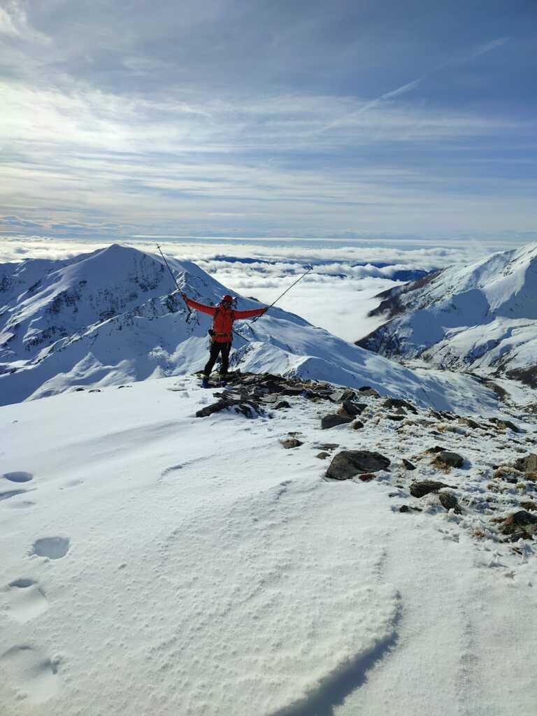 Allí quitamos pieles, e hicimos por ligero descenso hasta la pala sur antes de llegar a la cima. otra vez pusimos pieles, y con una pequeña ascensión, hicimos cumbre de la primera cima del día, el Tuc de Moror (2.732 m).